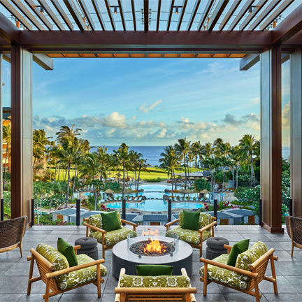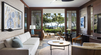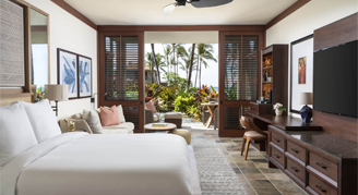 Ocean-View Rooms are located on the lower level in the King’s Pond, Seashell, Beach Tree and Palm Grove crescents and feature views of the ocean. Rooms feature a Nespresso machine, 65-inch LED TV, Klipsch wireless Bluetooth speakers and Makana Honua bath amenities. Most lower-level rooms include an outdoor lava-rock garden shower.