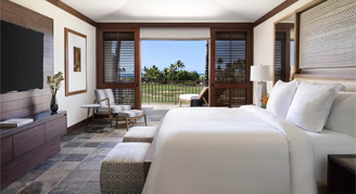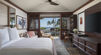 Golf/Ocean-View Rooms are located on the upper and lower level in the ‘Ulu Terrace and feature views of the Jack Nicklaus Hualalai golf course. Rooms feature a walk-in closet, Nespresso machine, 65-inch LED TV, Klipsch wireless Bluetooth speakers and Makana Honua bath amenities.