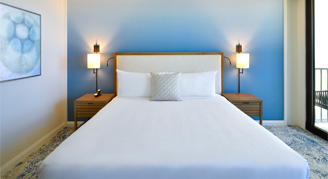 Elegantly appointed guest rooms offer a full balcony with décor and furnishings in variations of white with gray, beige, and blue accents. Bathrooms exude cool and modern elegance with porcelain floors, marble vanity, and a deep soaking tub. Rooms are located on floors 19 - 23 and feature sweeping views of the Pacific Ocean.