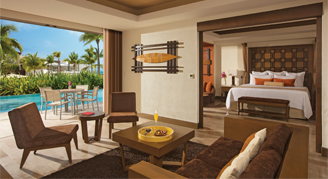 Suites are located on the ground floor and feature a garden view. Additional amenities include a separate living area, a soaking tub and direct pool access.