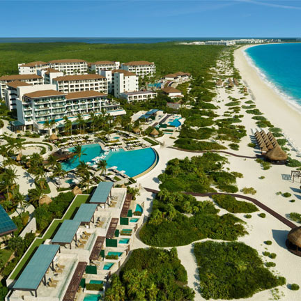 This all-inclusive resort is exclusively for adults, and features two pools, nine restaurants, seven bars and lounges, 424 spacious suites, a fitness center, a nightclub, and a 16,000-square foot spa with an outdoor hydrotherapy. Guests may enjoy all-inclusive privileges at the neighboring Dreams Playa Mujeres Golf & Spa Resort.