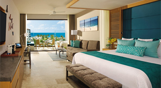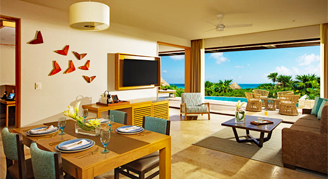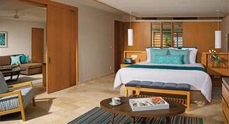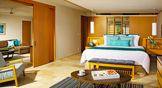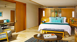 Suites are located on the second floor and feature a partial-ocean view or an ocean view. Additional amenities include direct access to a pool, a whirlpool tub in the bathroom, a living and dining area, and a separate bedroom. Guests 13 and older are welcome in this category.