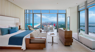 Suites feature a partial-ocean view or an ocean view. Additional amenities include a living and dining area, an in-room soaking tub and a corner terrace.