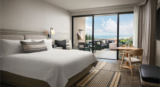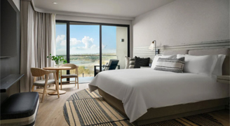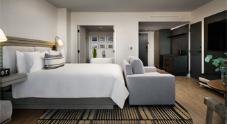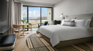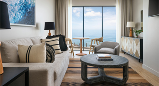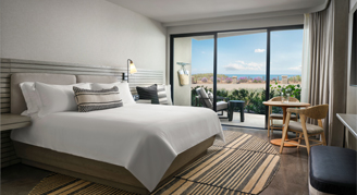 Studios feature one king bed, an additional sitting area, a bathroom with dual vanity sinks, shower and soaking tub, and a private balcony with coastline views of the Pacific Ocean, South Ponto Beach, Highway 101 and Batiquitos Lagoon. Additional amenities include a 65” flat-screen TV, Tivoli Audio Model One Bluetooth and Spa Alila bath amenities.