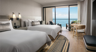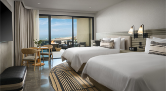 Rooms feature two queen beds, a bathroom with a shower, and a private balcony overlooking the pool and the Pacific Ocean. Additional amenities include a 65” flat-screen TV, Tivoli Audio Model One Bluetooth and Spa Alila bath amenities.