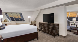 Rooms are located in the Tower Building, which is adjacent to the Pyramid Building. These stylishly functional rooms are considered the most efficient footprint yet. This clutter-free environment features a 50" flat-screen TV, multiple charging and power outlets, and a multi-purpose element that doubles as a wardrobe, storage, work surface and media center. These rooms were made to feel more natural, with both functional and accent lighting, and art that consist of images of the Mojave Desert.