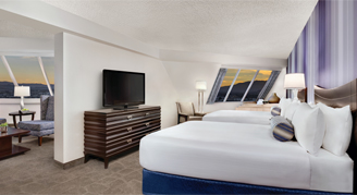 A Suite Fit for Royalty. Live like royalty in this queen suite. This Pyramid Suite features a soaking tub with a view, adjoining sitting room, and two queen beds.