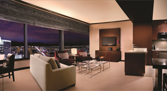 Suite provides an escape from the hustle and bustle of The Strip, and features a full-sized kitchen, dining table for four, living room with queen-size sofa bed, 50-inch Digital LCD flat-screen TV, additional guest powder room, and a separate bedroom including king bed with pillow-top mattress, walk in shower and a spa-style soaking tub.