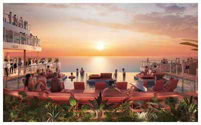 The Hideaway: Located 135 feet above the ocean is the first suspended infinity pool at sea, which is the centerpiece to this unique, adults-only neighborhood. Other features include a multilevel sun terrace with whirlpools and a bar.
