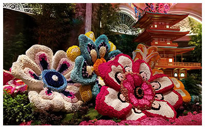 One must-see in Vegas is the Conservatory at The Bellagio. The display when we went was a Japanese-themed garden, complete with a beautiful replica of Osaka Castle, an intimidating dragon you can walk through (made of rice!), and even a huge Hello Kitty in kimono. This was one of my son’s favorite places to walk through in Las Vegas.