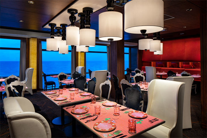 Main Restaurant: Impeccable service, classic design, world-class cuisine and comfortable sophistication are celebrated here. Experience tableside lobster presentation, an expansive selection of artisanal cheeses from around the world, or the extensive American and French wine list. Charming and timeless, Murano transports you, through palate and décor, to a modern and refined level of dining. Complimentary for all guests.