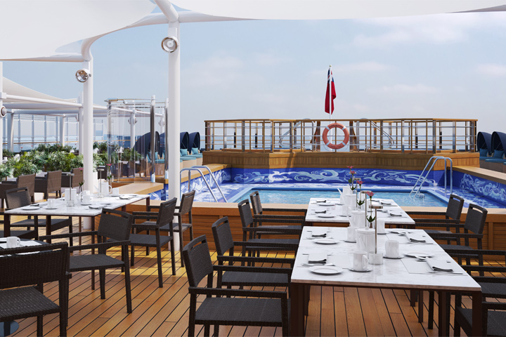 The Verandah: Steakhouse at The Verandah restaurant offers a sublime experience, whether it's lunch or dinner. Showcasing specialties such as prime USDA grain-finished New York strip steak and Alaskan king crab, alongside dishes celebrating British origin such as Salt Marsh lamb rack, as well as renowned Wagyu beef from farther afield. The menu is a celebration of the fine provenance of the US, British Isles and Australia. The Verandah takes design inspiration from the original Verandah Grill on board Queen Mary. This restaurant is available for an additional cost.
