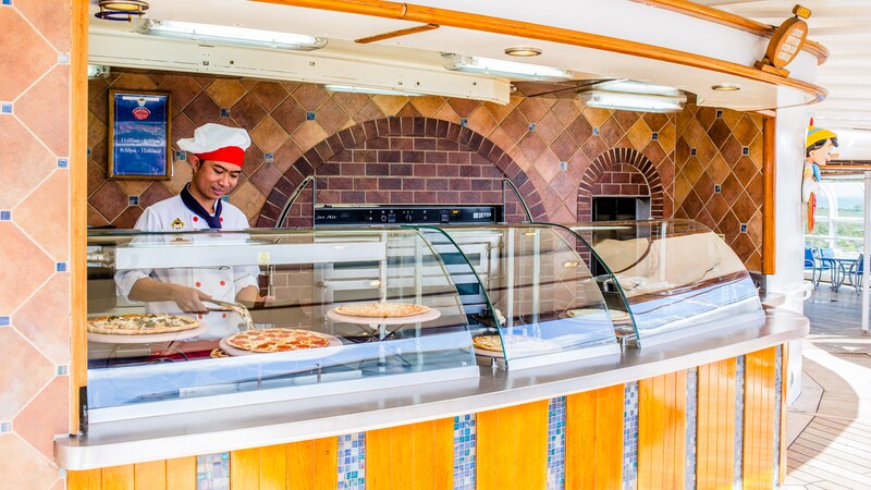 Pinocchio's Pizzeria: Pinocchio's Pizzeria, a Quick Service dining location on Deck 9, Midship next to Goofy's Pool on the Disney Magic, is an outdoor snack spot serving pizza throughout the day.