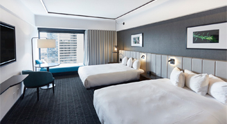• Hôtel Bonaventure Montréal has 397 spacious rooms and suites each offering unsurpassed comfort. Proposing an exceptional view of downtown Montreal or on the 2.5 acres of the hotel's landscaped gardens, each room ensures an unforgettable experience during your stay. All rooms and suites provide a smoke-free environment. These also feature a work desk as well as a spacious bathroom, a safe and several amenities that offer comfort and simplicity at its best. Enjoy the year-round heated outdoor pool, hot tub, dry sauna, fitness room and unlimited internet access during your stay. Accessible rooms featuring roll-in showers and handlebars for guests with reduced mobility are also available.