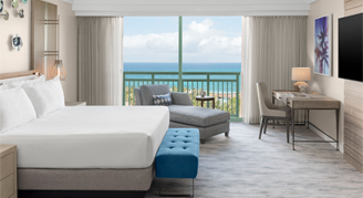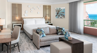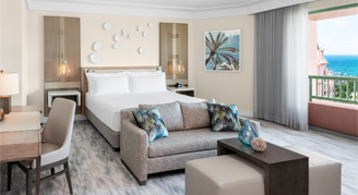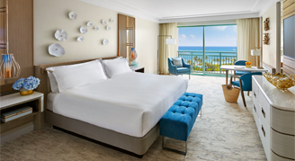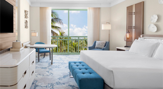 These recently renovated guest rooms bring a fresh, modern look and feel to the most iconic hotel at Atlantis. This room features a King Bed, arm chair and seating area, a modern sitting table with two chairs and floor-to-ceiling windows with a French balcony overlooking the resort grounds.