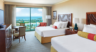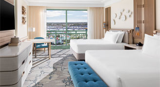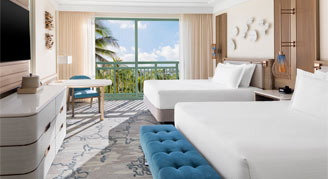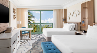 These recently renovated guest rooms bring a fresh, modern look and feel to the most iconic hotel at Atlantis. This room features two Queen Beds, a modern sitting table with two chairs and floor-to-ceiling windows with a French balcony. The updated bathroom features a combined shower-bathtub.