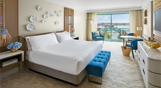 These recently renovated guest rooms bring a fresh, modern look and feel to the most iconic hotel at Atlantis. Located on floors 17 - 24, these rooms feature a King Bed, arm chair and seating area, a modern sitting table with two chairs and floor-to-ceiling windows with a French balcony offering premium marina or Nassau Harbor views and check-in privileges in the Sun Lounge. The updated bathroom features a combined shower-bathtub.
