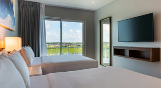 - Bedding: One King and a Sofa Bed or Two Queens and a Sofa Bed
