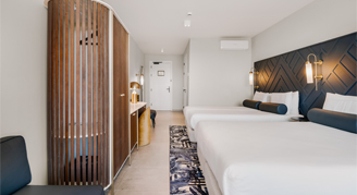 Located on various floors, all Standard Guest Rooms consist of one room with two king-sized beds. Each bedroom comes with a bathroom with a walk-in shower, a private balcony, a hair dryer, air conditioning, cable TV, coffee and tea facilities, safe, area rug, direct dial telephone, USB ports for phone charging and free wireless internet access. Rooms are available with a garden, pool or partial sea view.