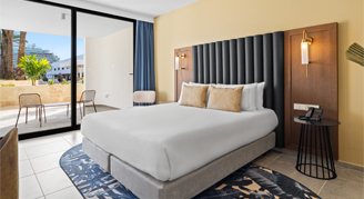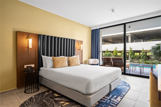Located on the ground floor, offers a king-size bed, a garden view and a private terrace with a connecting swim-up pool (adults only).