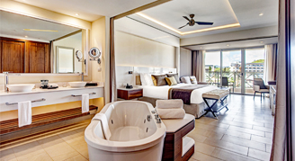 Suites feature an ocean view. Additional amenities include a separate living area and a soaker tub.