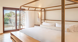 The bi-level suite offers a sense of airiness and a true connection with nature. Expect white fresh interiors with splashes of blue colour, Greek marble tabletops and original Greek artwork. The beautiful living room leads out to an intimate lush garden The private terrace unfolds to the perfect outdoor space with an intimate garden and a private heated pool. The suite can be extended into a two-bedroom family space. It'll all paint the perfect Greek summer canvas.