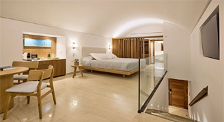 Rooms provide standard features and amenities with lounge seating corner. Outdoor space provides veranda with breakfast table, sunshade, daybeds and private pool.
