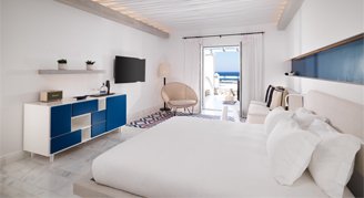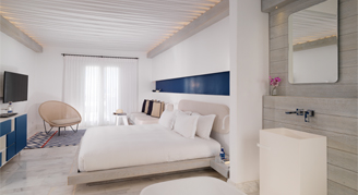 These rooms include spacious private terraces that come complete with an outdoor heated Jacuzzi. Views offer stunning vistas of the Aegean Sea.