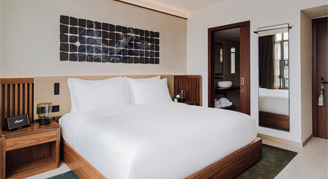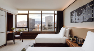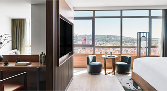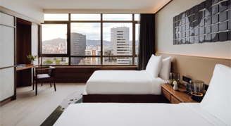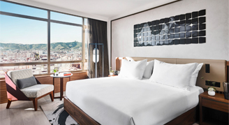 Overlooking cityscape vistas, the view truly shines when the sun sets and Barcelona lights up. Beyond the high-end comforts of the bedroom, marble bathrooms offer a spa-inspired experience with glass panel rainfall showers and Natura Bisse' bath amenities. Premium Skyline Twin Rooms with two single beds are available upon request.