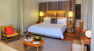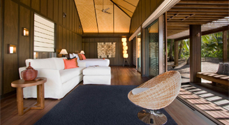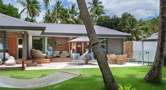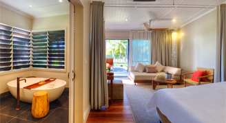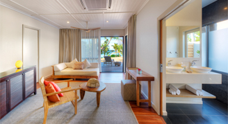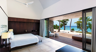 Villas are located beachfront. Includes an indoor bathroom as well as an outdoor bathing deck with shower and bathtub complete with privacy curtains and a wall around the decking. Amenities include an open floor plan with lounge area and day bed, reading chair, coffee table, writing desk, Bluetooth speaker and a privacy curtain between the bed and lounge areas. Outside deck includes two sun loungers, table and chairs, and several steps that lead to a grassy area in front of the Villa before stepping on to the beach. Some interconnecting Villas are available in this room category.