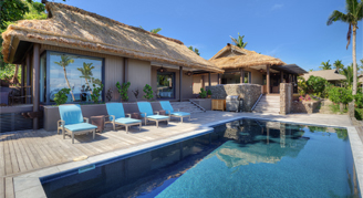 Villas are freestanding units located on the west side of the island where you can enjoy sunset views. Bedroom one has a king bed with connected bathroom. Bedroom two is specifically designed for children and features a set of bunk beds. Amenities include an outdoor bathtub or shower that adjoins the master suite. The villa also features an additional bathroom with a shower as well as a small kitchenette. Large glass doors flow onto a spacious outdoor stone paved deck with day bed and sun loungers that overlook the fenced 16.5-foot swimming pool. A small adjoining paddle pool is perfect for splash and playtime. Formerly Known as the Two-Bedroom Pool Villa.
