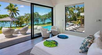 Villas are located beachfront. Amenities include an open floor plan with lounge area and daybed, reading chair and coffee table, writing desk, Bluetooth speaker, eight USB ports, a privacy curtain between bed and lounge areas, and a shower and bath. Also features an outside deck with two sun loungers, table and chairs, and three to four stairs that lead down to a grassy area in front of the villa before stepping onto the beach. Some interconnecting Villas are available in this category.