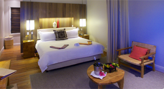 Villas are raised from the ground, free standing and located on the hillside, with lower Hillside Villas featuring garden views and higher Hillside Villas featuring water views. Amenities include an open floor plan with lounge area and daybed, reading chair and coffee table, writing desk, Bluetooth speaker, eight USB ports, a privacy curtain between bed and lounge areas, and a shower and bath. Also features an outside deck with two chairs and a chill-out day bed.