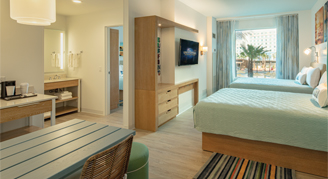 Unwind every day in a light and airy escape with views of the pool. Suites flow between two bedrooms, featuring a kitchenette and bathroom with separate bath and vanity areas.