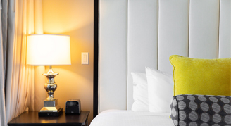 Beautiful and spacious suite elegantly appointed with 150-year aged French oak flooring and featuring a private balcony. Accessible features include toilet grab bars, accessible sink, vanity and desk, and visible notification for phone, door, and alarms.