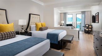 Two-bedroom two-bathroom suite with a separate living room. This suite overlooks Fifth Avenue with 600 sq feet of balcony space and all the appropriate furniture to enjoy the lively street and relax in the sun.
