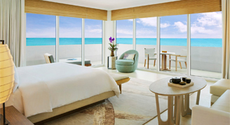 Additional villa features include sweeping water and city-skyline views, a large balcony, large living room, airport transfer, private fitness center, priority seating at Nobu Miami and Ocean Social and personal concierge services.