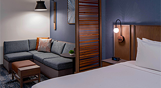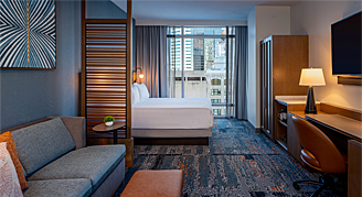 This 460-square-foot, ADA-friendly room includes city views from oversized windows, one king bed, a roll-in shower, a Cozy Corner with sofa bed, and work area.