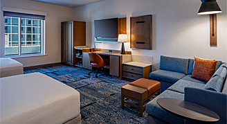 Make yourself at home inside this 460-square-foot, ADA-friendly room featuring a roll-in shower, one king bed or two queen beds, a Cozy Corner with sofa bed, and work area.