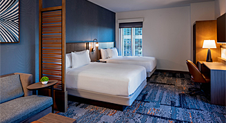 This 460-square-foot, ADA-friendly room includes city views from oversized windows, two queen beds, a roll-in shower, a Cozy Corner with sofa bed, and work area.