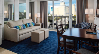Each Villa has a living room area with a pull-out sofa bed. Villas also feature a balcony with views of the gulf, tub/shower, full kitchen with fridge/freezer, stovetop, microwave, coffee maker, toaster, dishware, in-room safe, Wi-Fi, and a flat-screen TV with cable.