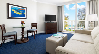 Each Villa has a separate bedroom and a living room area with a pull-out sofa bed. Villas also feature a balcony with a resort view, tub/shower, full kitchen with fridge/freezer, stovetop, microwave, coffee maker, toaster, dishware, in-room safe, Wi-Fi, and a flat-screen TV with cable.
