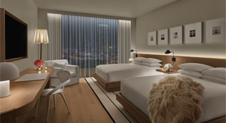 A luxurious personal escape, faceted with floor-to-ceiling windows, lined in walnut paneling and an enclosed rainforest shower. Superior Rooms include two comfortable queen-sized beds with exclusively curated linen only at EDITION Hotels.