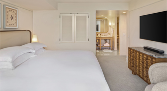 These newly renovated rooms feature a view of Waikiki. Rooms are located on floors 8 to 15 and are complimented by white oak cabinetry and marble countertops.