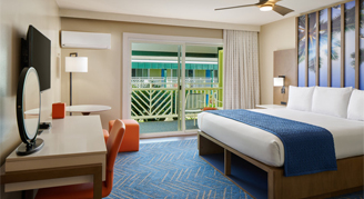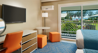 Newly renovated rooms feature views that vary between the hotel gardens, surrounding mountains or pool area. These rooms also have a bathroom with a shower/tub combo, apartment-sized refrigerator, microwave, Keurig coffee maker, electric skillet, toaster, and dishes and cutlery.