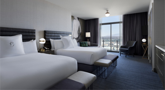 Enjoy some of the best views Vegas has to offer from a plush living area and two uniquely styled bedrooms. The expansive master bedroom boasts a king-size bed while the secondary bedroom contains two queen-size beds. Each bedroom has a luxurious bathroom and a stylish powder room is situated off the central living area, perfect for entertaining guests. With unexpected amenities and unique touches, the suite redefines the luxury experience.