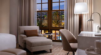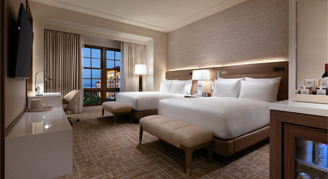 The Resort Room includes either one king or two queen beds, subject to availability at check-in, plus an oversized marble bathroom with step-in shower. Amenities include LED vanity mirrors for spa-like illumination, a fully stocked minibar, 65″ smart TV, Nespresso machine, Conair garment steamer, automated lighting control system, plush robes and a vintage inspired analog alarm clock with Bluetooth audio and integrated wireless charging.