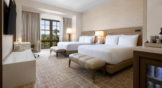 The room includes two queen beds with views of the surrounding urban area and landscaping, plus it offers an oversized marble bathroom with step-in shower. Amenities include LED vanity mirrors for spa-like illumination, a fully stocked minibar, 65″ smart TV, Nespresso machine, Conair garment steamer, automated lighting control system, plush robes and a vintage inspired analog alarm clock with Bluetooth audio and integrated wireless charging.