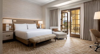 The room includes one king bed with views of the Resort's backyard including vineyards, the Las Vegas Strip or Resort Pool. Is also offers an oversized marble bathroom with step-in shower. Amenities include LED vanity mirrors for spa-like illumination, a fully stocked minibar, 65″ smart TV, Nespresso machine, Conair garment steamer, automated lighting control system, plush robes and a vintage inspired analog alarm clock with Bluetooth audio and integrated wireless charging.