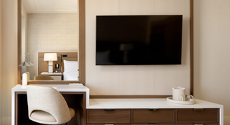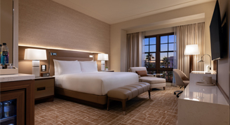 This room includes one king bed and views of the surrounding urban area and landscaping, plus an oversized marble bathroom with step-in shower. Amenities include LED vanity mirrors for spa-like illumination, a fully stocked minibar, 65″ smart TV, Nespresso machine, Conair garment steamer, automated lighting control system, plush robes and a vintage inspired analog alarm clock with Bluetooth audio and integrated wireless charging.